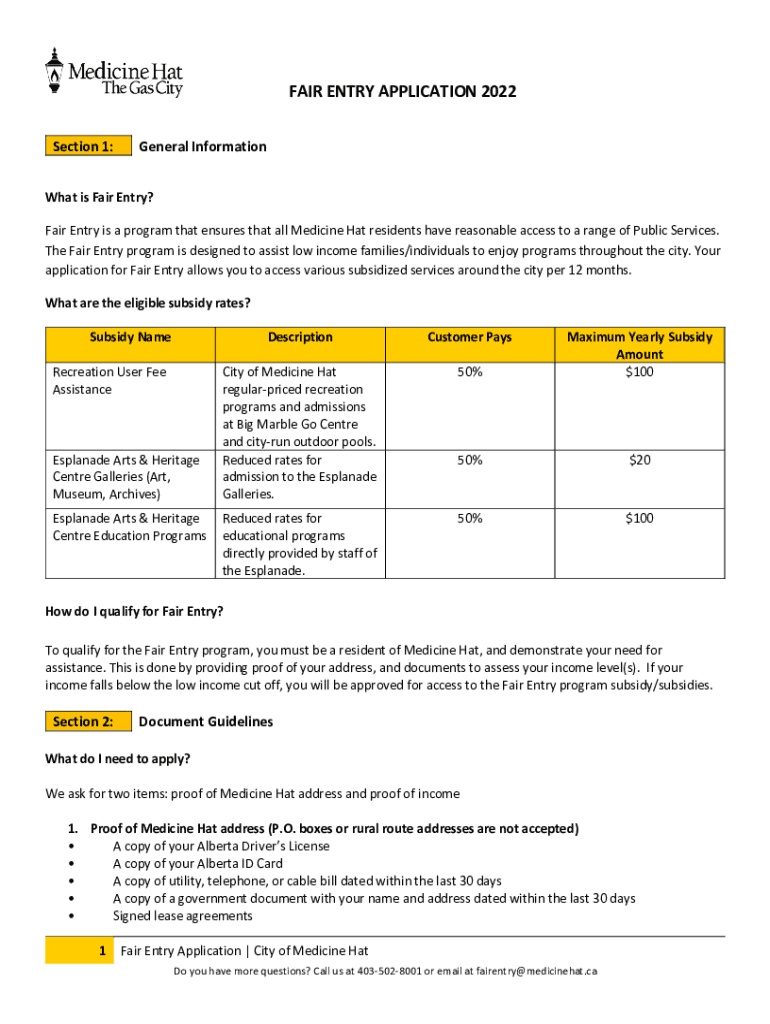FAIR ENTRY APPLICATION 2022 Section 1:General Informational is Fair Entry? Fair Entry is a program that ensures that all Medicine Hat residents have reasonable access to a range of Public Services.