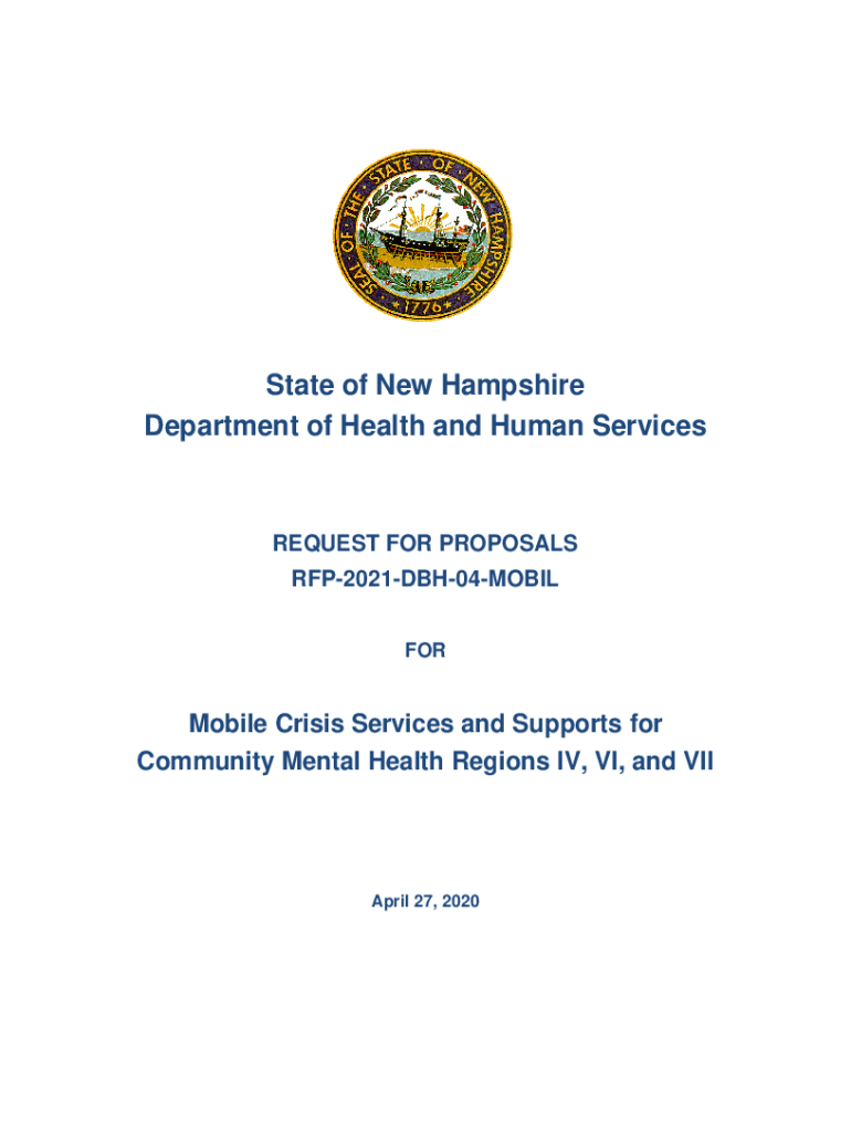 State of New Hampshire Department of Health and Human ServicesREQUEST FOR PROPOSALS RFP2021DBH04MOBIL FOR Mobile Crisis Services and Supports for Community Mental Health Regions IV, VI, and VII April