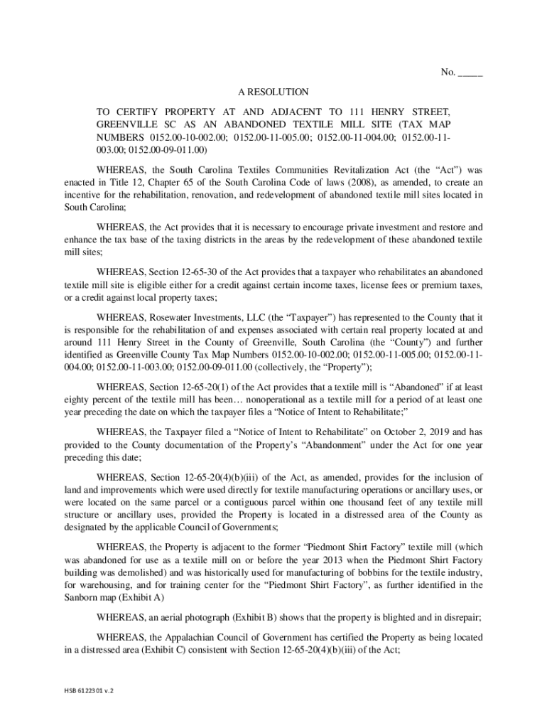 No. ___ A RESOLUTION TO CERTIFY PROPERTY AT AND ADJACENT TO 111 HENRY STREET, GREENVILLE SC AS AN ABANDONED TEXTILE MILL SITE (TAX MAP NUMBERS 0152.0010002.00; 0152.0011005.00; 0152.0011004.00; 0152.0011003.00;