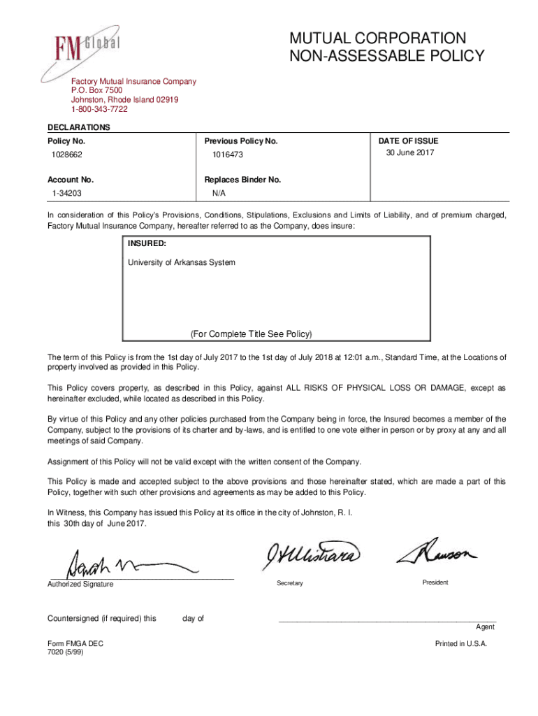 MUTUAL CORPORATION NONASSIGNABLE POLICY Factory Mutual Insurance Company P.O. Box 7500 Johnston, Rhode Island 02919 18003437722 DECLARATIONS Policy No. Previous Policy No.1028662DATE OF ISSUE 30 June