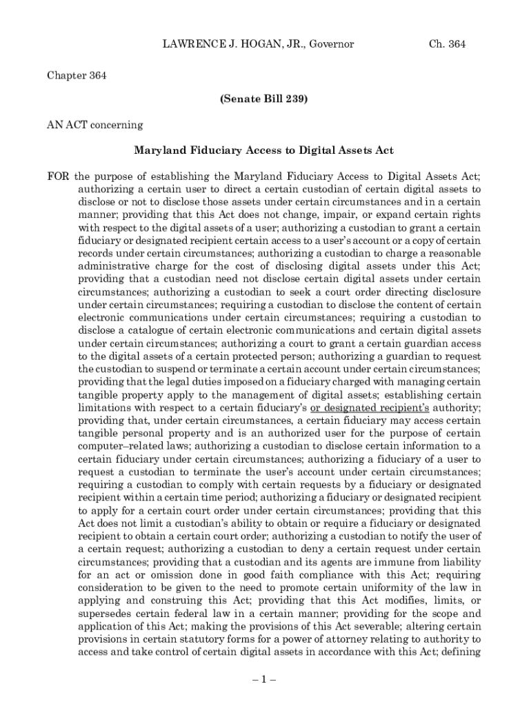 LAWRENCE J. HOGAN, JR., Governor Ch. 364Chapter 364 (Senate Bill 239) AN ACT concerning Maryland Fiduciary Access to Digital Assets Act FOR the purpose of establishing the Maryland Fiduciary Access