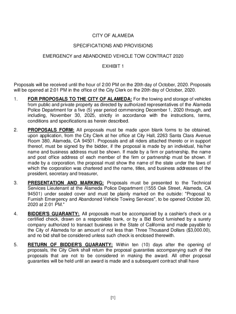CITY OF ALAMEDA SPECIFICATIONS AND PROVISIONS EMERGENCY and ABANDONED VEHICLE TOW CONTRACT 2020 EXHIBIT 1Proposals will be received until the hour of 2:00 PM on the 20th day of October 2020. Proposals