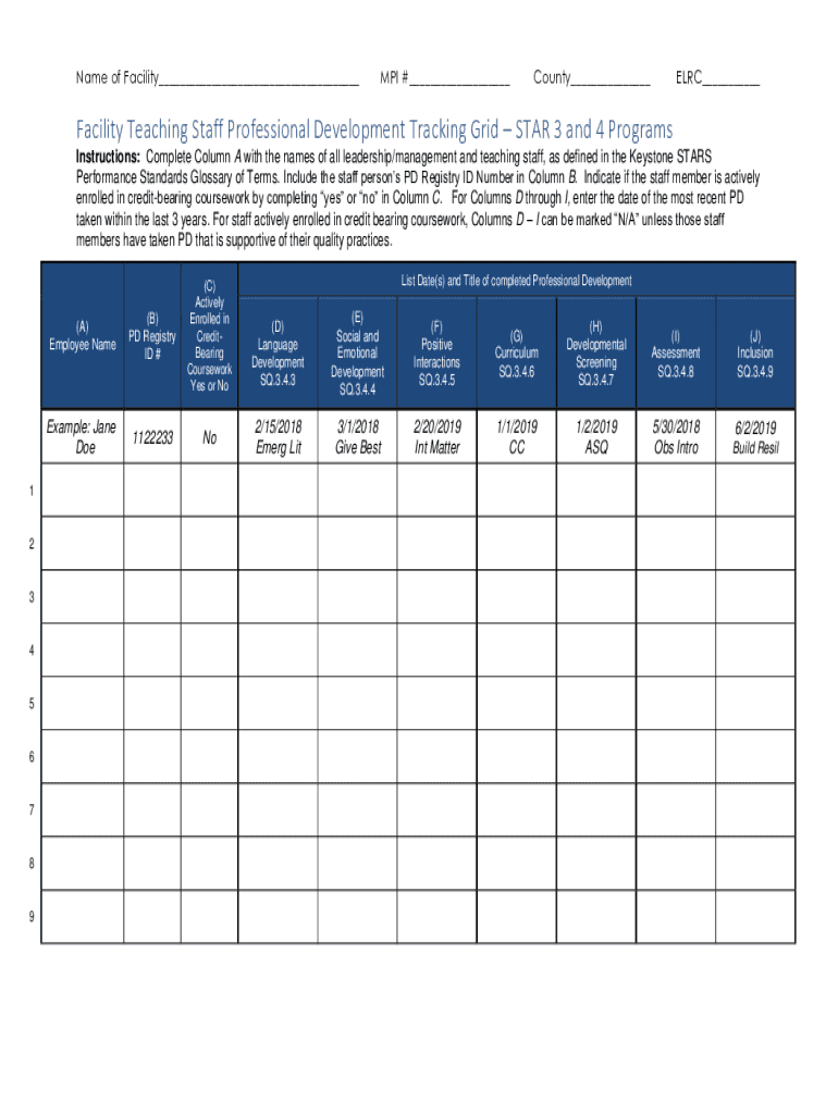 Name of Facility___MPI #___County___ELRC___Facility Teaching Staff Professional Development Tracking Grid STAR 3 and 4 Programs Instructions: Complete Column A with the names of all leadership/management