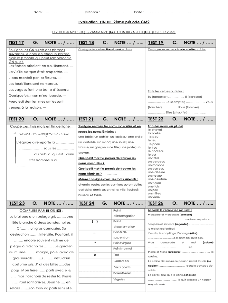 Not :. Prom :. Date : Evaluation FIN DE 2me pride CM2 ORTHOGRAPHY (O.) GRAMMAR (G.) CONJUGATION (C.) (TESTS 17 36)TEST 17G.NOTE /. Soigné LES GN sets DES phrases servants. A ct de claque phrase,