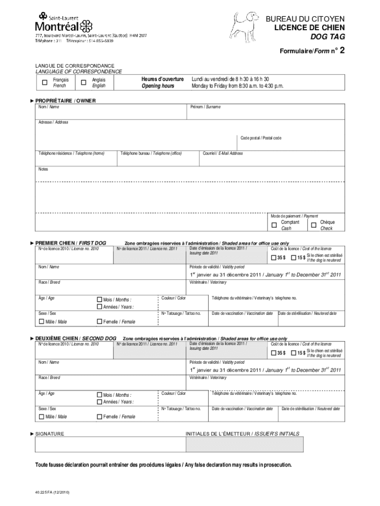 BUREAU DU CITIZEN License DE CHIEF DOG TAG Formula ire/Form no2LANGUE DE CORRESPONDENCE LANGUAGE OF CORRESPONDENCE Francis FrenchHeures Ouverture Opening hoursAnglais EnglishLundi AU vended DE 8 h