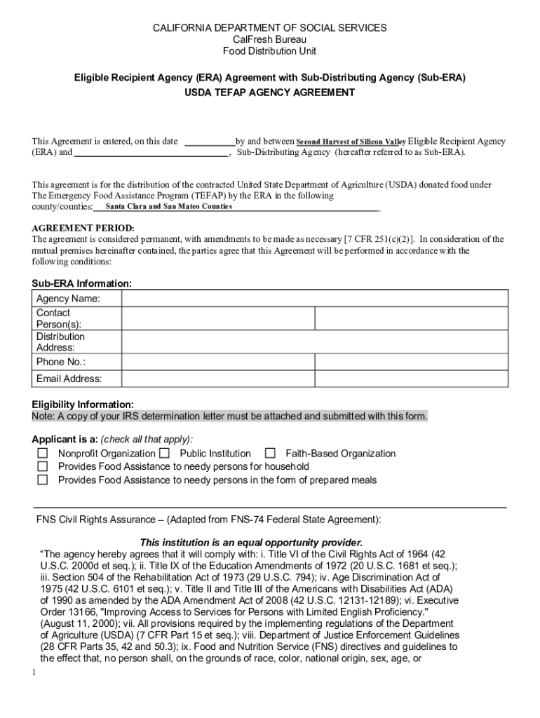 CALIFORNIA DEPARTMENT OF SOCIAL SERVICES Afresh Bureau Food Distribution Unit Eligible Recipient Agency (ERA) Agreement with Distributing Agency (SubERA) USDA TEF AP AGENCY Agreements Agreement is