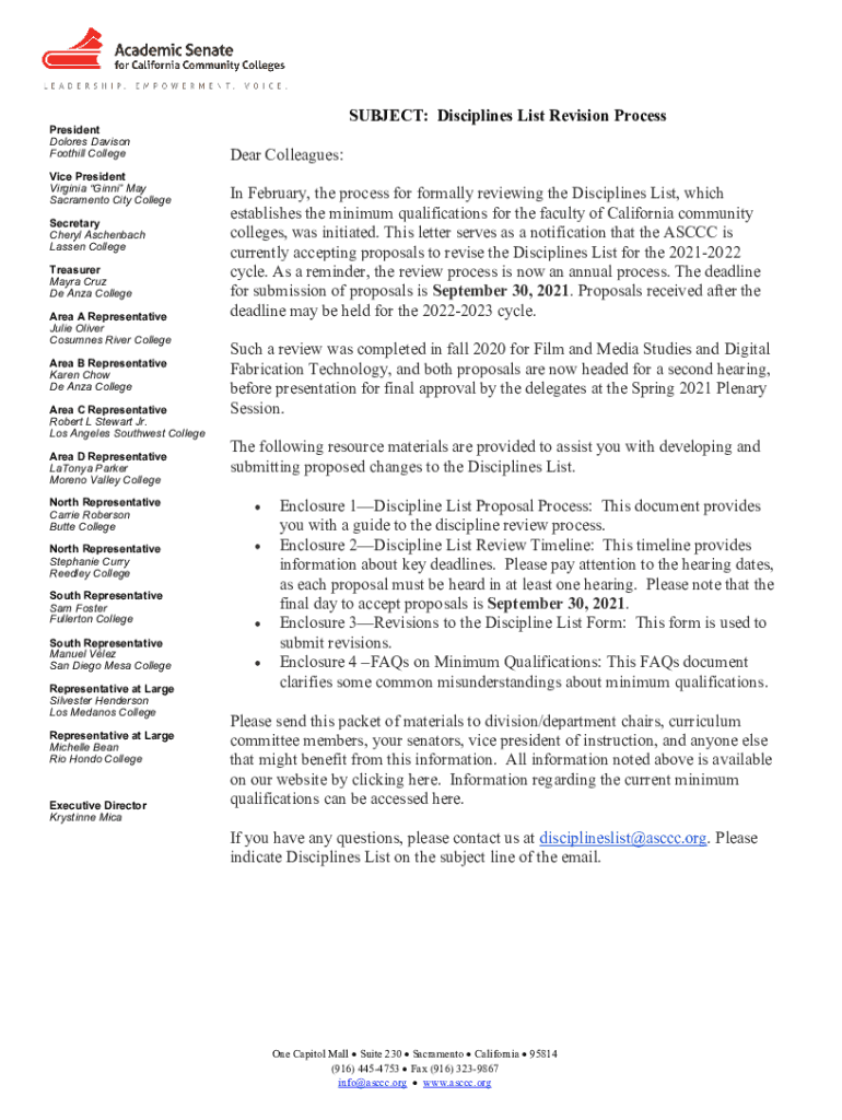 President Dolores Davison Foothill College Vice President Virginia Ginny May Sacramento City College Secretary Cheryl Paschen-Back Lassen College Treasurer Mayra Cruz De Anza College Area A Representative