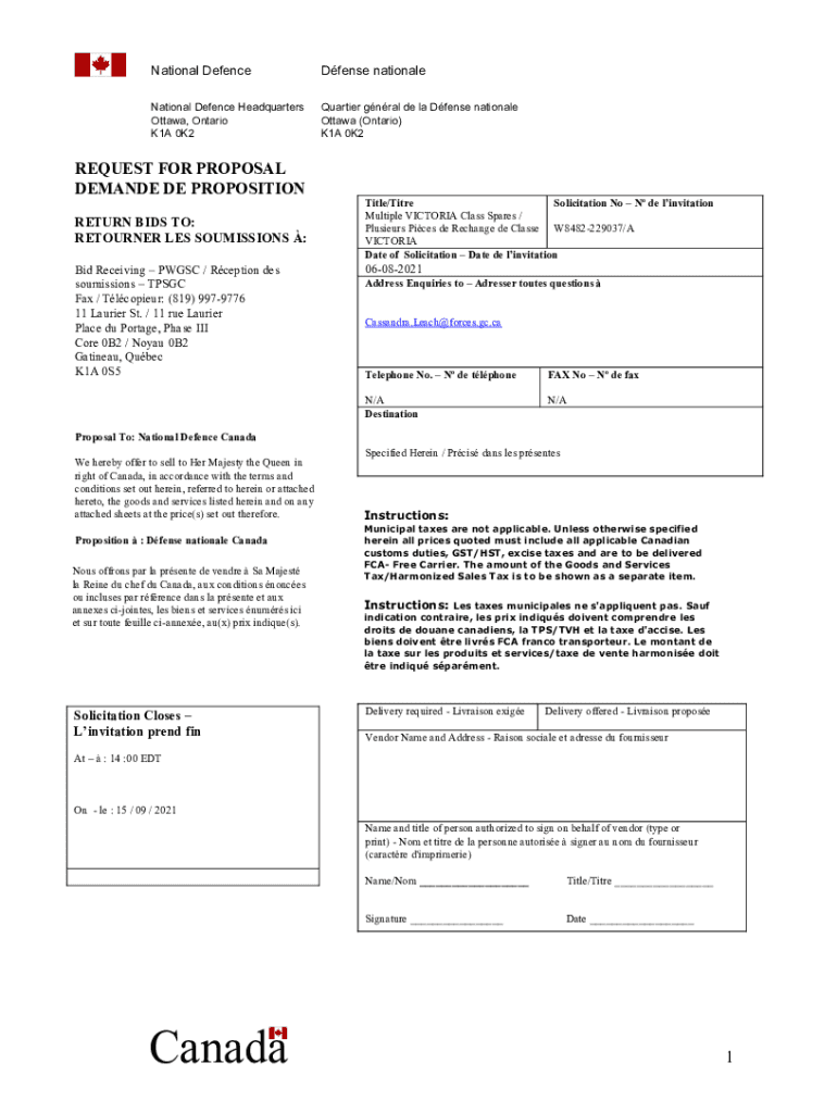 National DefenceDfense nationaleNational Defense Headquarters Ottawa, Ontario K1A 0K2Quartier gnarl DE la Defense national Ottawa (Ontario) K1A 0K2REQUEST FOR PROPOSAL DEMAND DE PROPOSITION RETURN