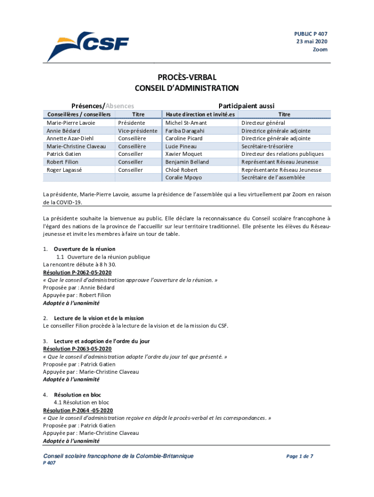 PUBLIC P 407 23 Mai 2020 ZoomPROCSVERBAL CONSENT ADMINISTRATION Presences/Absences Conspires / considers Marie Pierre Lavoie Annie Board Annette AzarDiehl Marie Christine Plateau Patrick Gawain Robert