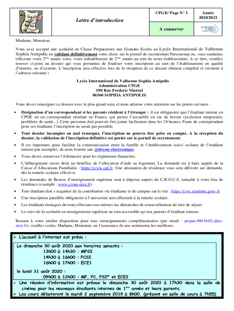CPGE/ Page N 1Lettre dintroductionAnne 2020/2021A conserved Madame, Monsieur, Vows ave accept one solaria en Class Preparatory aux Grades Ecol BS AU Lace International de Valbonne Sophia Annapolis