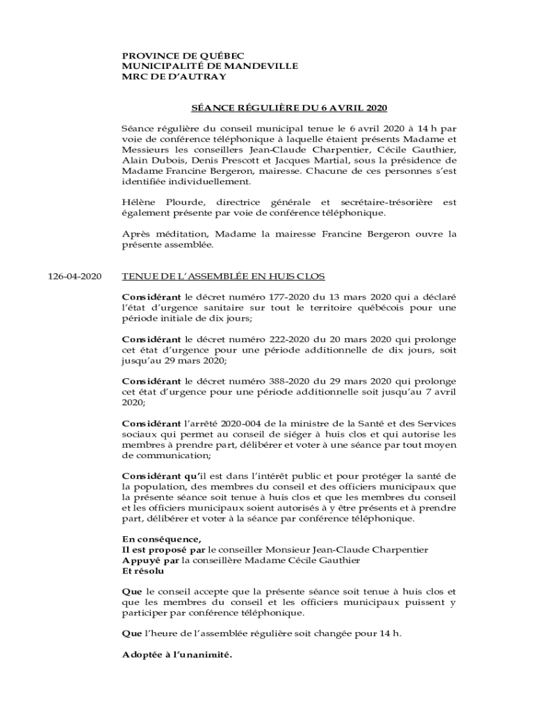 PROVINCE DE QUEBEC MUNICIPALITY DE MANDEVILLE MRC DE DAUTRAYSANCE REGULAR DU 6 APRIL 2020 Since regular Du Conrail municipal tenure LE 6 April 2020 14 h par voice DE conference technique LaBelle talent