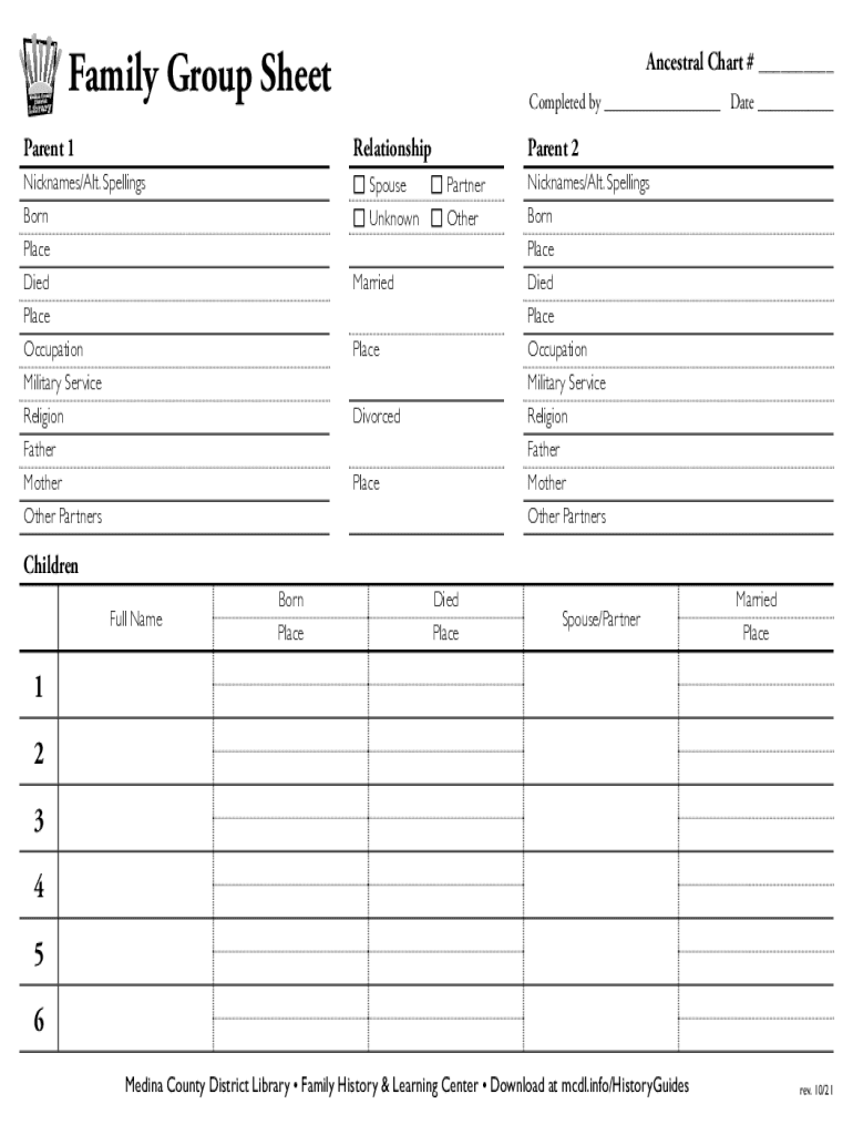 Family Group Sheet Parent 1Ancestral Chart # ___ Completed by ___ Date ___RelationshipNicknames/Alt. Spellings Born Place Died Place Occupation Military Service Religion Father Mother Other PartnersSpouse