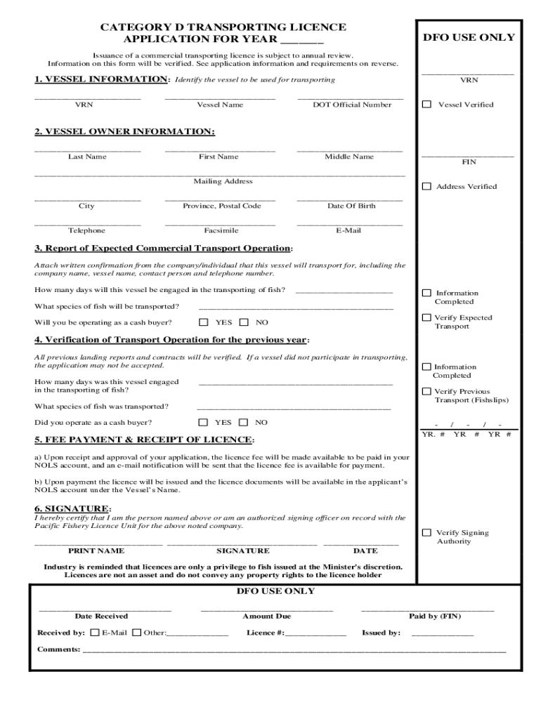 CATEGORY D TRANSPORTING License APPLICATION FOR YEAR ___DFO USE ONLYIssuance of a commercial transporting license is subject to annual review. Information on this form will be verified. See application