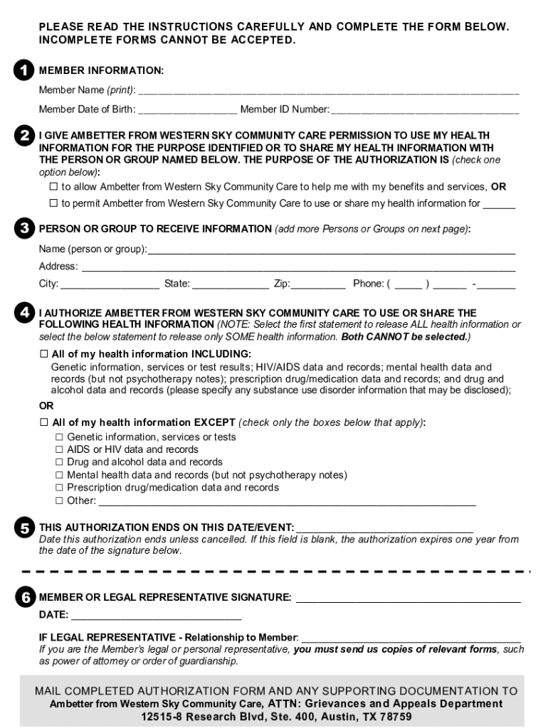 Authorization to Use and Disclose Health Information125158 Research Blvd, Ste. 400 Austin, TX 78759Notice to Member: Completing this form will allow Am better from Western Sky Community Care to (i)