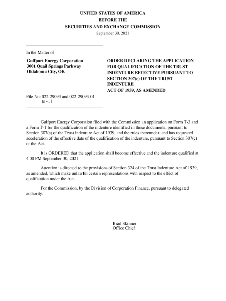 UNITED STATES OF AMERICA BEFORE THE SECURITIES AND EXCHANGE COMMISSION September 30, 2022___ In the Matter of Gulfport Energy Corporation 3001 Quail Springs Parkway Oklahoma City, ORDER DECLARING