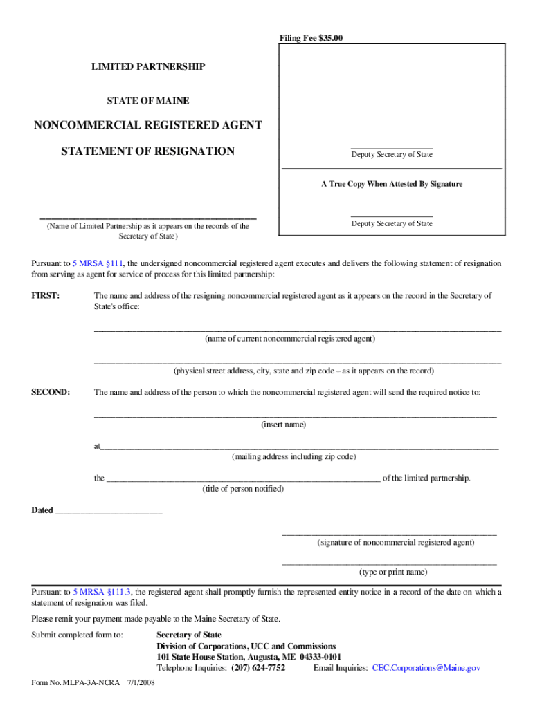 Filing Fee $35.00LIMITED PARTNERSHIPSTATE OF MAINENONCOMMERCIAL REGISTERED AGENT STATEMENT OF RESIGNATION___ Deputy Secretary of State True Copy When Attested By Signature___ (Name of Limited Partnership