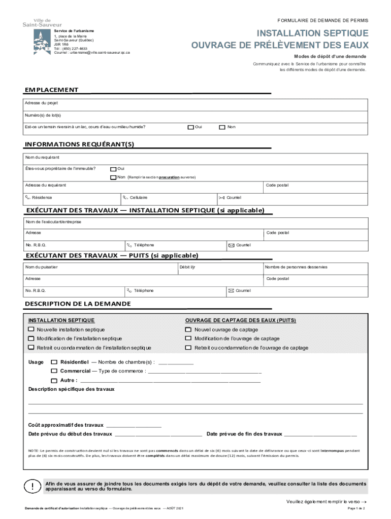 FORMULA IRE DE DEMAND DE PERMISINSTALLATION ANTIQUE OUTRAGE DE PAVEMENT DES EAUXService de urbanism 1, place DE la Masai SaintSauveur (Quebec) J0R 1R6 Tl : (450) 2274633 Courier : urbanisme@ville.saintsauveur.qc.caModes