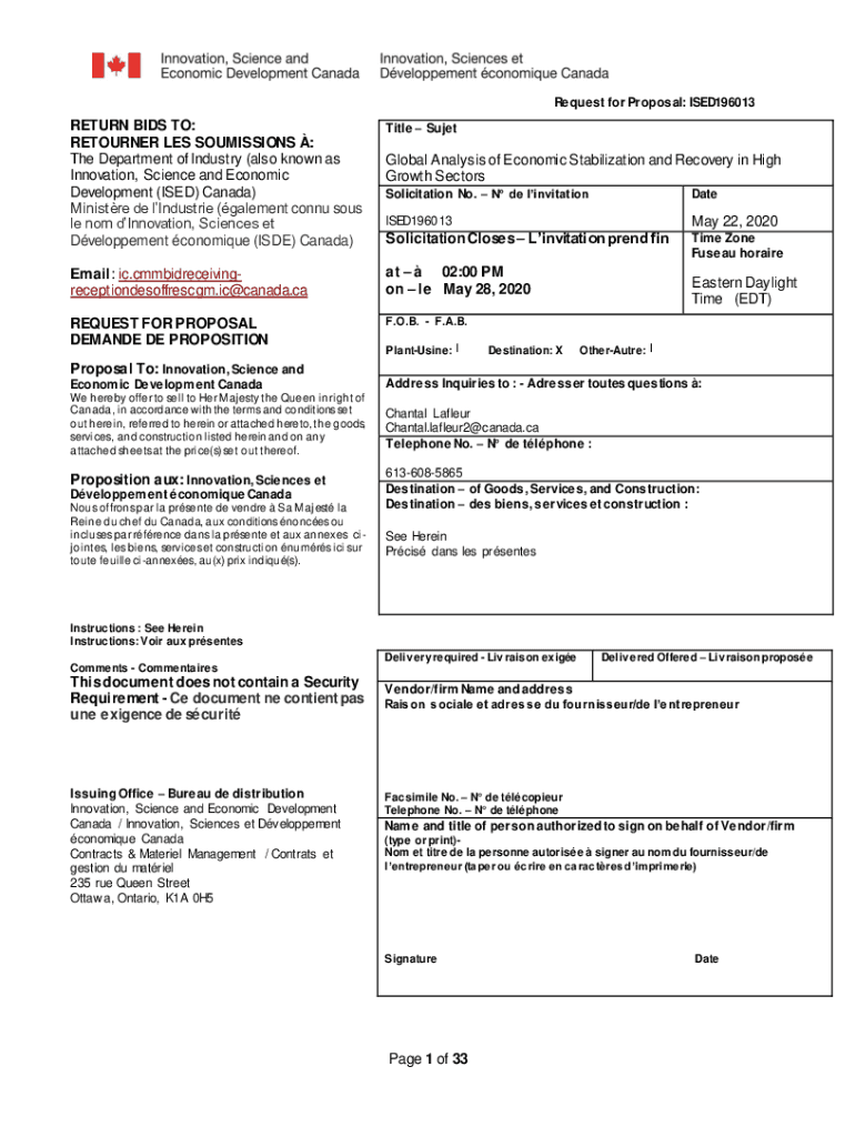 Request for Proposal: ISED196013RETURN BIDS TO: RETURNER LES COMMISSIONS : The Department of Industry (also known as Innovation, Science and Economic Development (USED) Canada) Minister DE industries