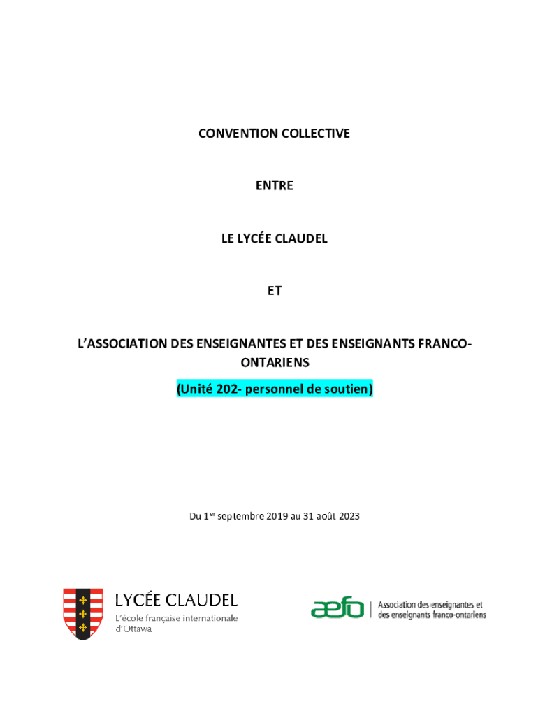 CONVENTION COLLECTIVEENTRELE LACE CLAUDELETLASSOCIATION DES ENSEIGNANTES ET DES ENSEIGNANTS FRANCOONTARIENS (Unit 202 personnel DE southern)Du 1er September 2019 au 31 AOT 2023LYCEE CLAUDE L\'Cole