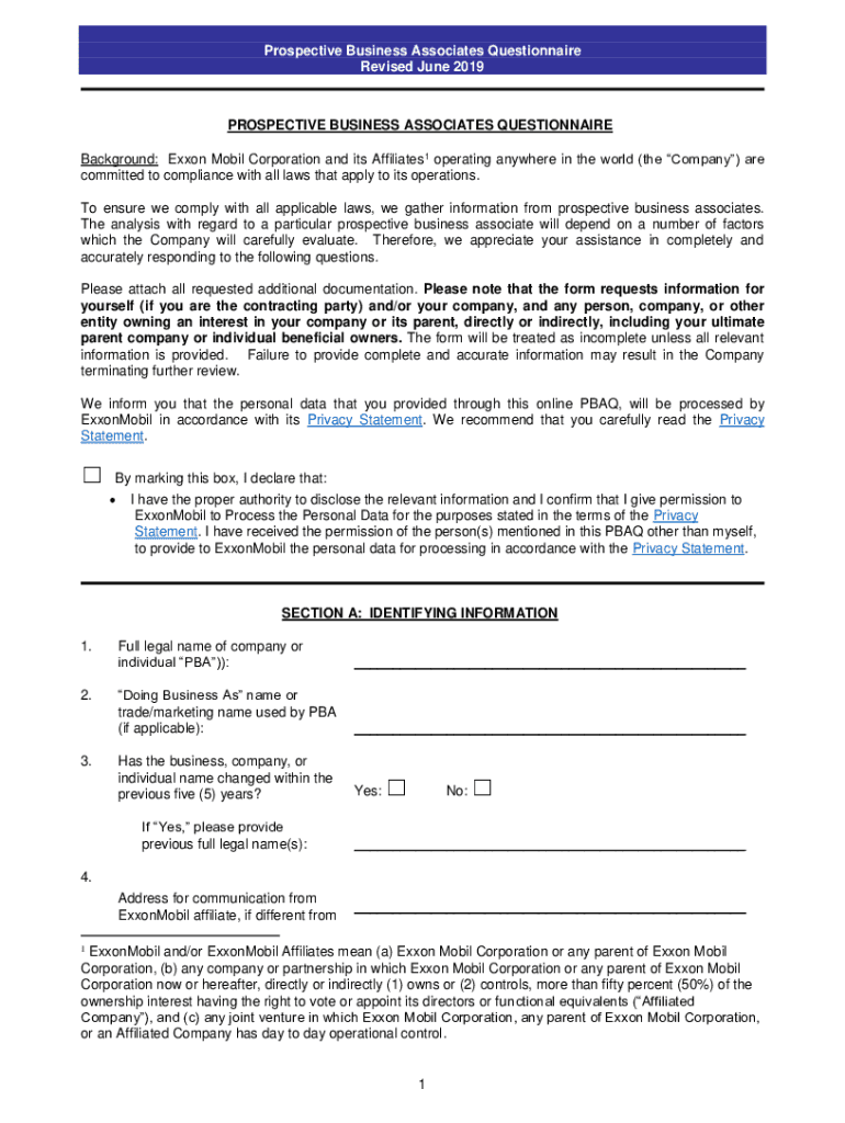 Prospective Business Associates Questionnaire Revised June 2019PROSPECTIVE BUSINESS ASSOCIATES QUESTIONNAIRE Background: ExxonMobil Corporation and its Affiliates1 operating anywhere in the world