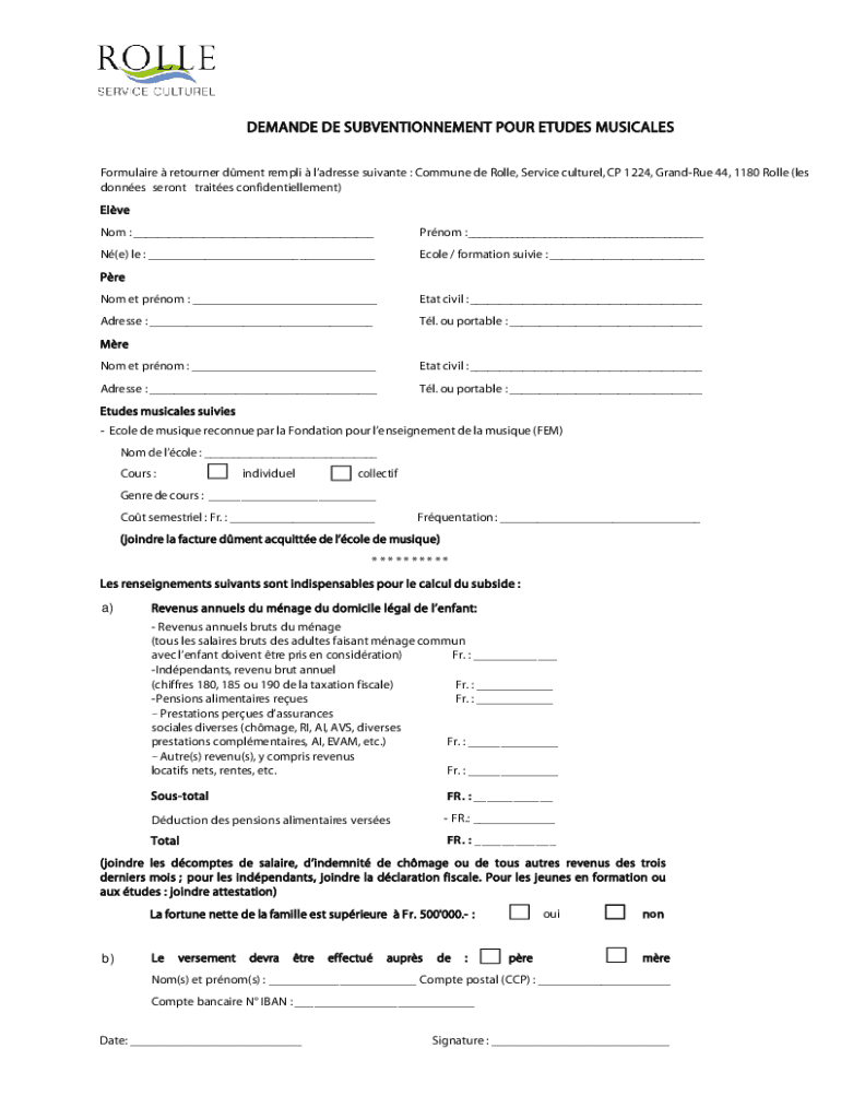 DEMAND DE SUBVENTIONNEMENT POUR Études MUSICALES Formula ire returner dent temple lacrosse private : Commune de Rolle, Service cultural, CP 1224, Grandeur 44, 1180 Role (LES donnés second traits