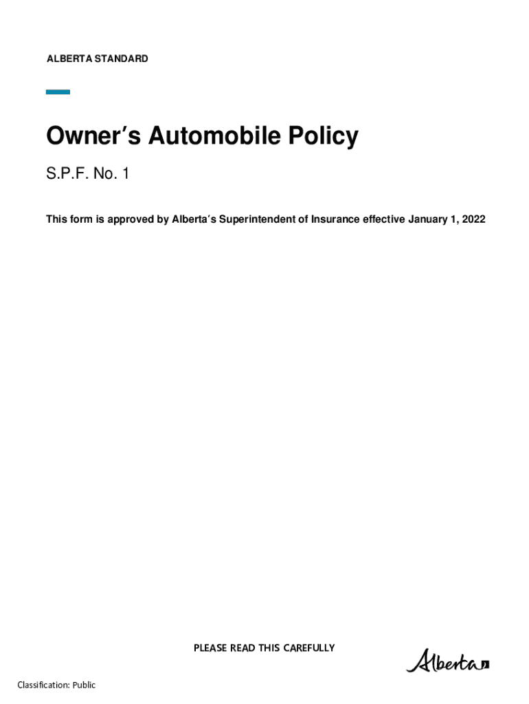 ALBERTA Standardizers Automobile Policy S.P.F. No. 1 This form is approved by Alberta's Superintendent of Insurance effective January 1, 2022PLEASE READ THIS CAREFULLYClassification: PublicContents