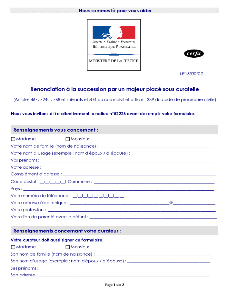 Nous Somme l pour vows aiderN15830×02Renonciation la succession pa run major place sous curate (Articles 467, 7241, 768 ET servant set 804 Du code civil ET article 1339 Du code DE procedure civil)Nous