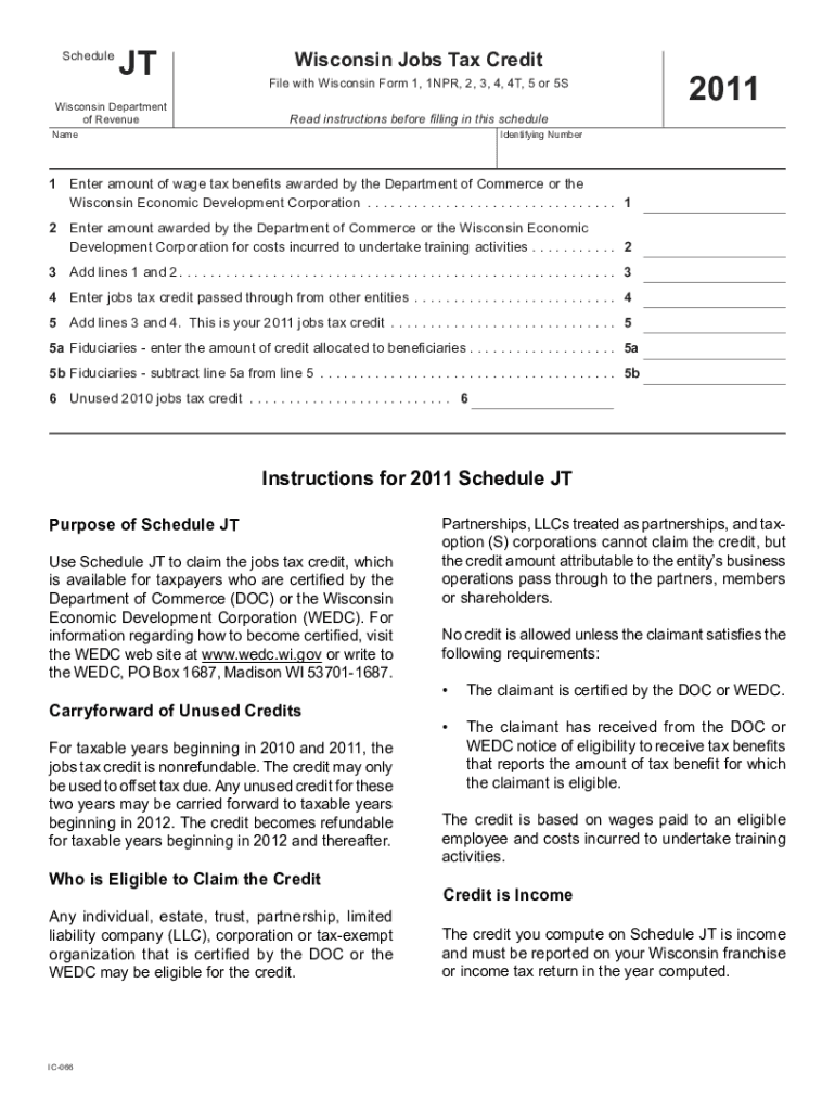 ScheduleJTWisconsin Department of Revenue Wisconsin Jobs Tax Credit File with Wisconsin Form 1, 1NPR, 2, 3, 4, 4T, 5 or 5S2011Read instructions before filling in this scheduleNameIdentifying Number1