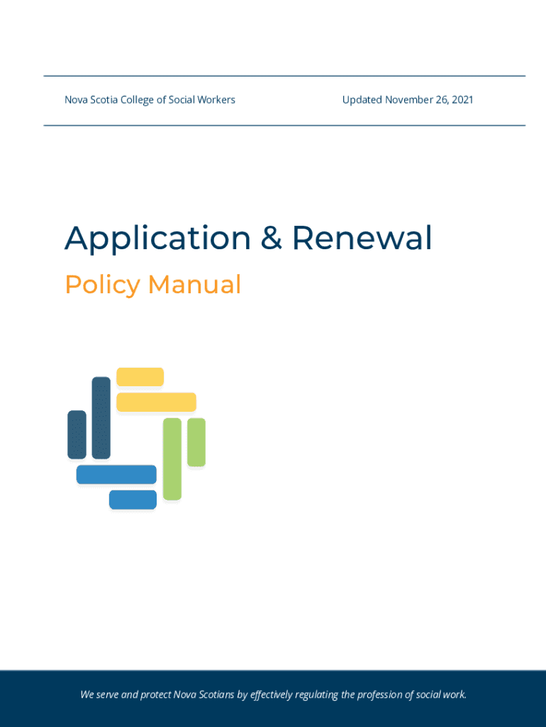 Nova Scotia College of Social WorkersUpdated November 26, 2021Application & Renewal Policy ManualWeregulate the Where served and protect Nova Scotland by effectively regulating the profession of social