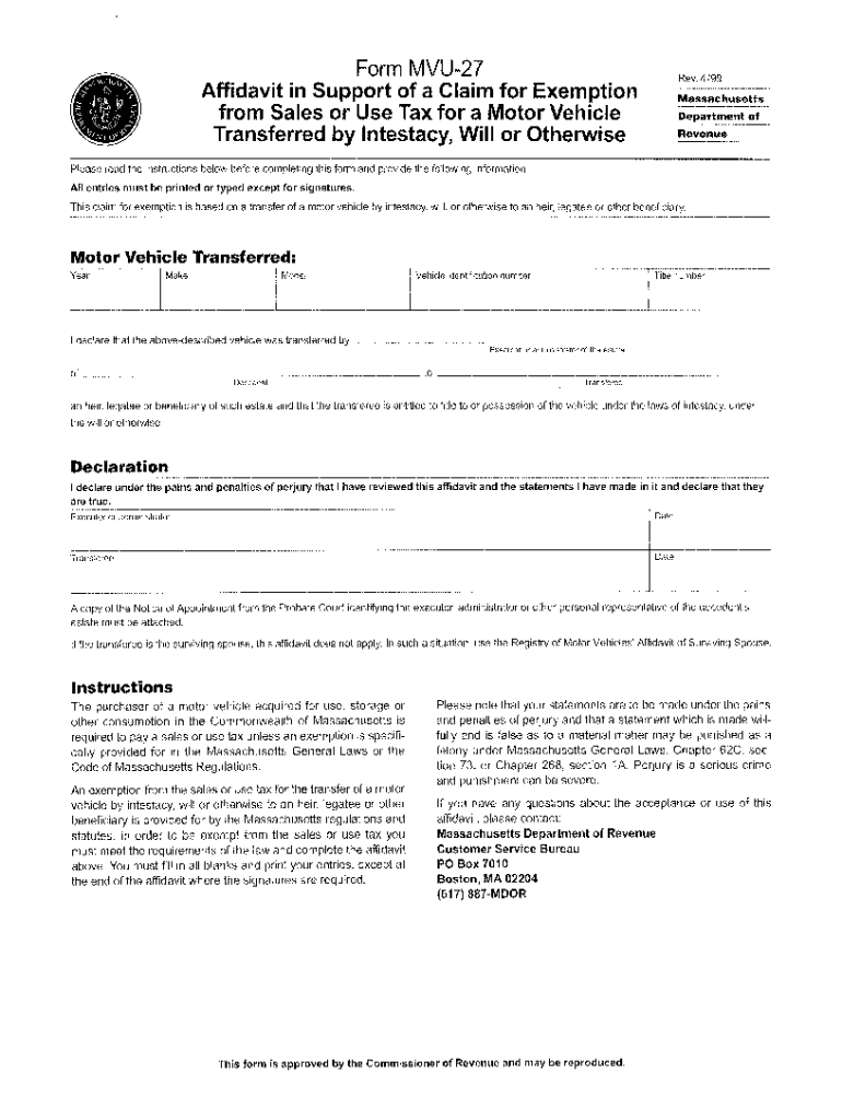 Form MVU27Rev. 4/99Affidavit in Support of a Claim for Exemption from Sales or Use Tax for a Motor Vehicle Transferred by Intestacy, Will or Otherwise Massachusetts Department of RevenuePlease read