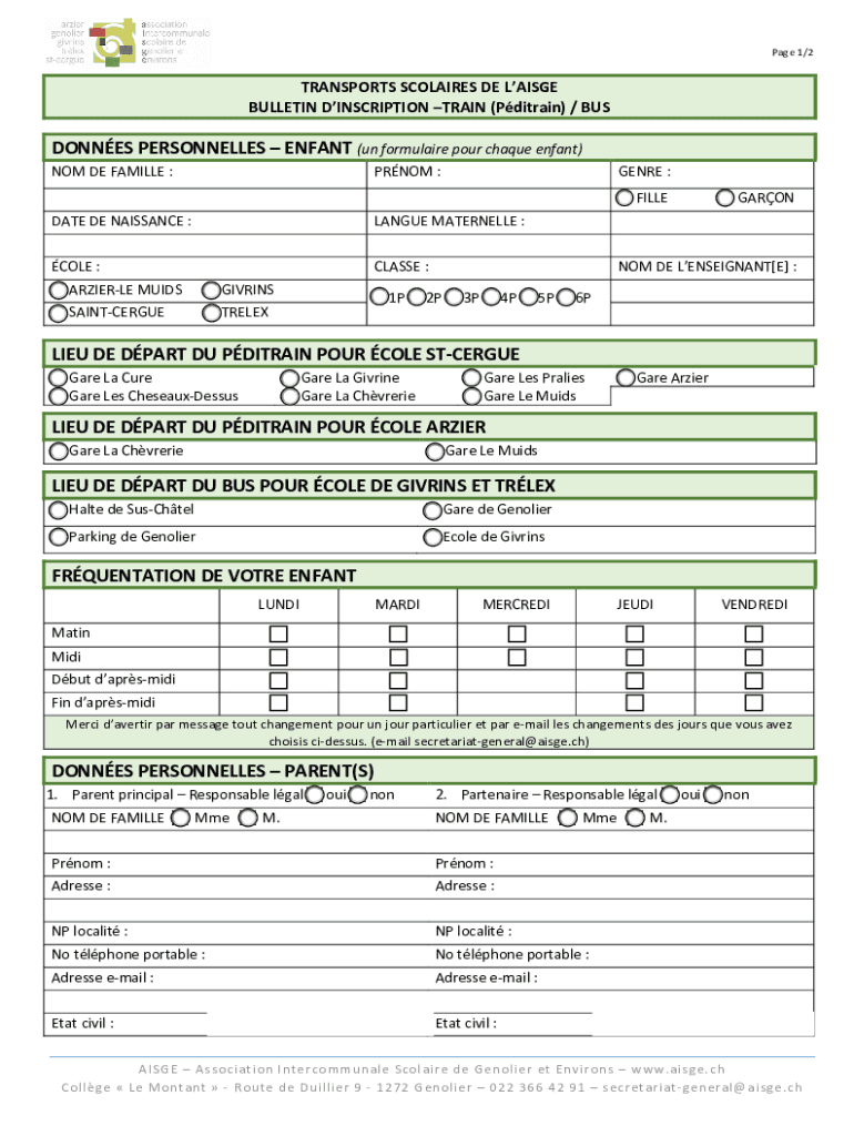 Page 1/2TRANSPORTS SCHOLARS DE LARGE BULLETIN INSCRIPTION TRAIN (Distrain) / DONNÉS PERSONNEL LES ENFANT (UN formula ire pour claque Enfant) NO MDE CAMILLE :PROM :GENRE : FILLED ATE DE RENAISSANCE