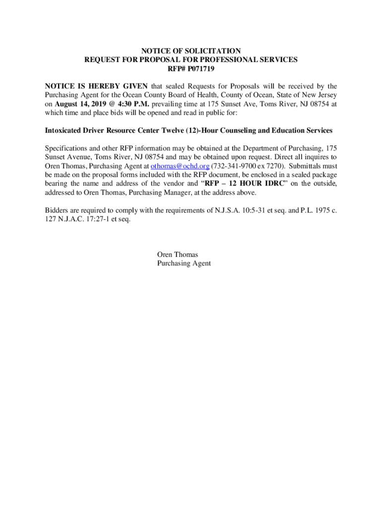 NOTICE OF SOLICITATION REQUEST FOR PROPOSAL FOR PROFESSIONAL SERVICES RFP# P071719 NOTICE IS HEREBY GIVEN that sealed Requests for Proposals will be received by the Purchasing Agent for the Ocean