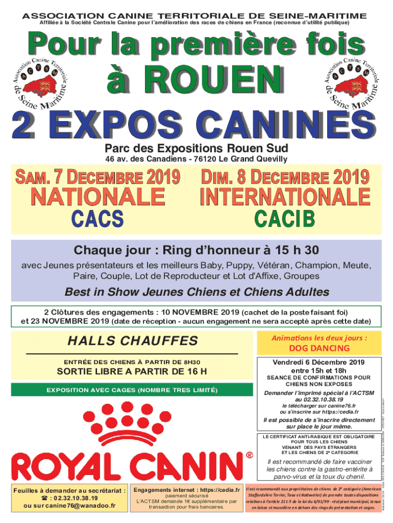 ASSOCIATION CANINE TERRITORIAL DE SEINEMARITIME Affiliate la So cit Central Canine pour amelioration DES races DE chains en France (reconquer utility oblique)Pour la premiere foil ROUEN 2 EXPOS CANINES