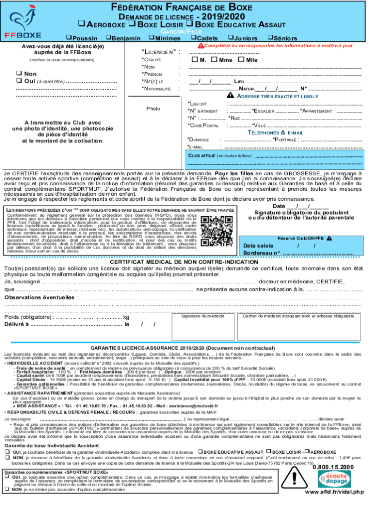 FORMATION FRANCHISE DE BOXEDEMANDE DE License 2019/2020 AEROBIC BOX LOIS BOX EDUCATIVE ASSAULT PoussinBenjaminAvezvous DJ t license(e) *License Nauru : DE la Above *CIVILITY (coached : la case correspond