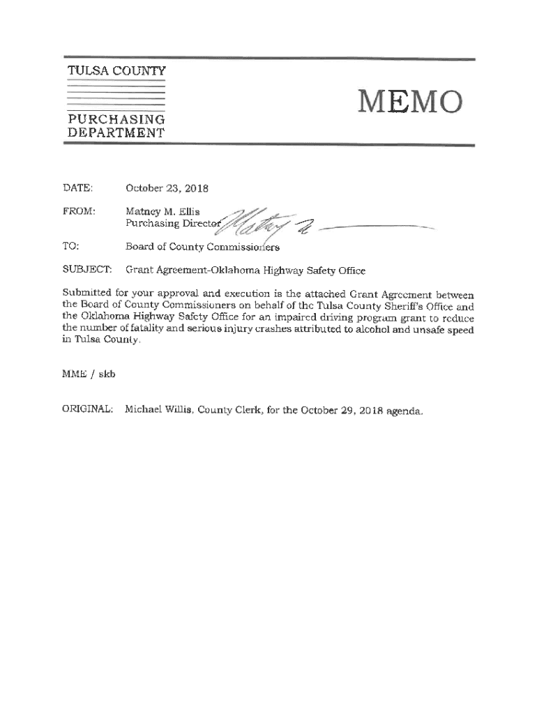 TULSA COUNTS PURCHASING DEPARTMENTAL:October 23, 2018FROM:Patna M. Ellis Purchasing Director\'?TO:Board of County Commission subject:Grant Agreement Oklahoma Highway Safety OfficeSubmitted for your