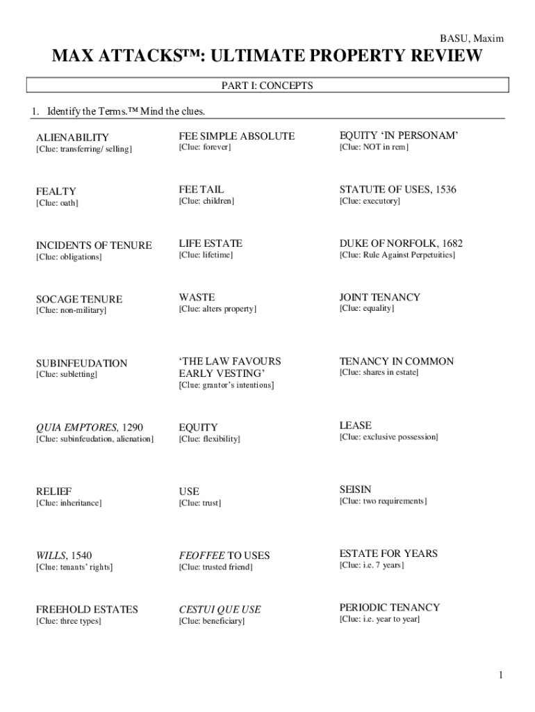 BASE, Maximal ATTACKS: ULTIMATE PROPERTY REVIEW PART I: CONCEPTS 1. Identify the Terms. Mind the clues. ALIENABILITYFEE SIMPLE ABSOLUTEEQUITY IN PERSONAM[Clue: transferring/ selling][Clue: forever][Clue: