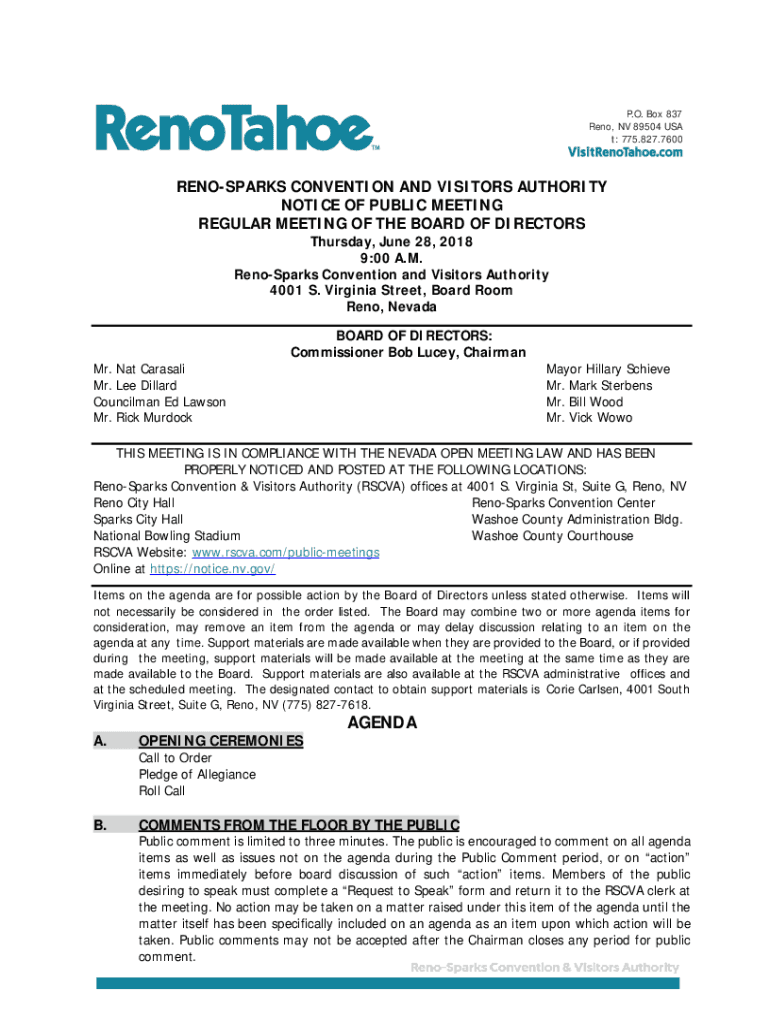 P.O. Box 837 Reno, NV 89504 USA t: 775.827.7600RENOSPARKS CONVENTION AND VISITORS AUTHORITY NOTICE OF PUBLIC MEETING REGULAR MEETING OF THE BOARD OF DIRECTORS Thursday, June 28, 2018 9:00 A.M. Reno