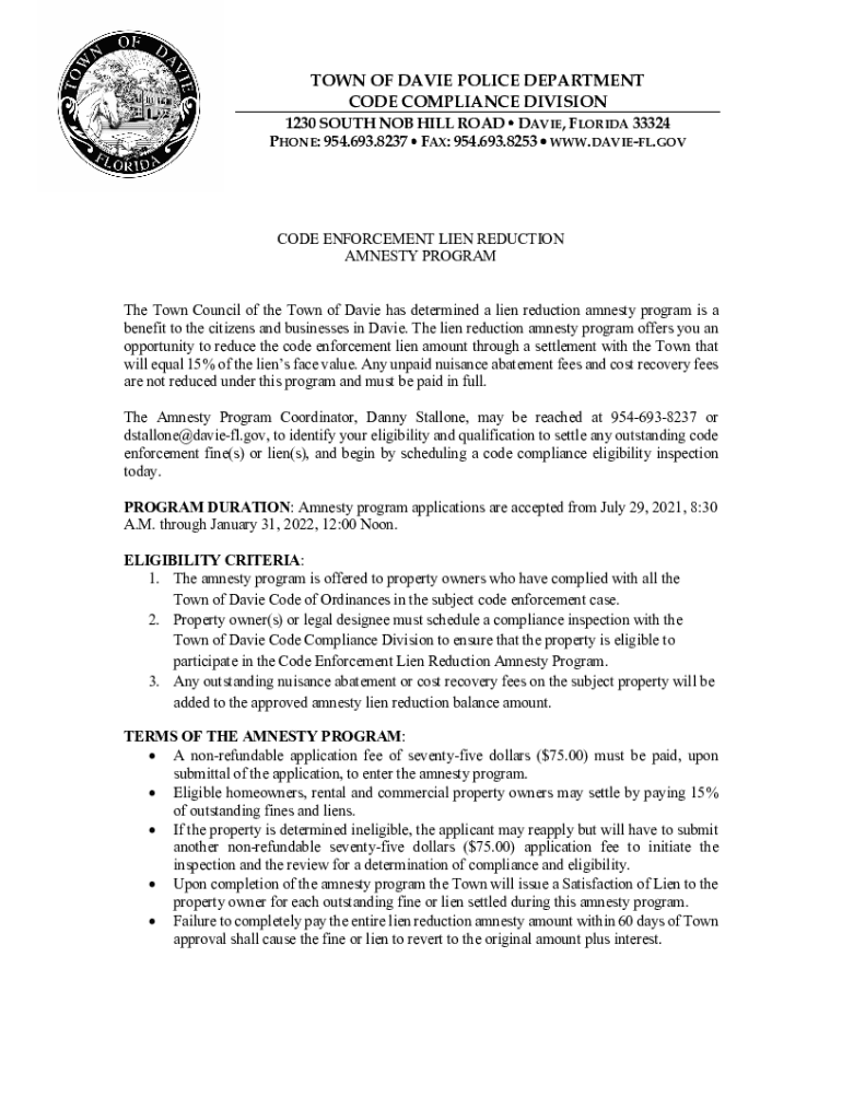 TOWN OF DAVIE POLICE DEPARTMENT CODE COMPLIANCE DIVISION 1230 SOUTH NOB HILL ROAD DAVIE, FLORIDA 33324 PHONE: 954.693.8237 FAX: 954.693.8253 WWW.DANIEL.GOODE ENFORCEMENT LIEN REDUCTION AMNESTY Program