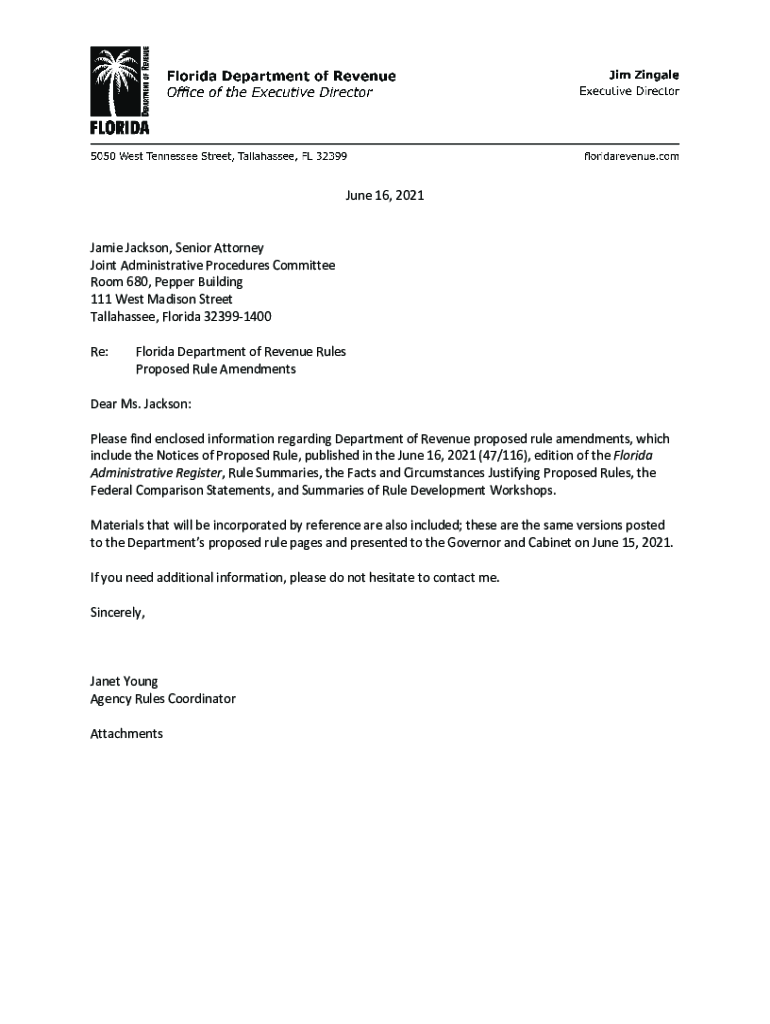 June16,2021 Jamie Jackson, SeniorAttorney JointAdministrativeProceduresCommittee Room680,PepperBuilding 111WestMadisonStreet Tallahassee,Florida323991400 Re: FloridaDepartmentofRevenueRules ProposedRuleAmendments