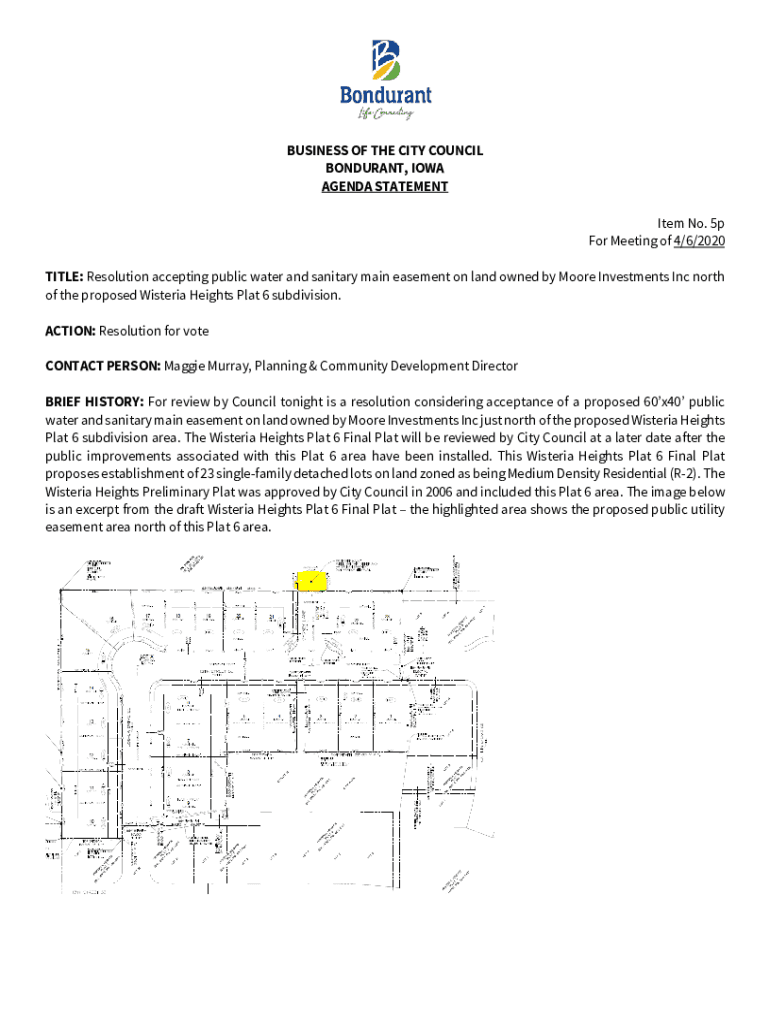 BUSINESS OF THE CITY COUNCIL HONDURAN, IOWA AGENDA STATEMENT Item No. 5p For Meeting of 4/6/2020 TITLE: Resolution accepting public water and sanitary main easement on land owned by Moore Investments