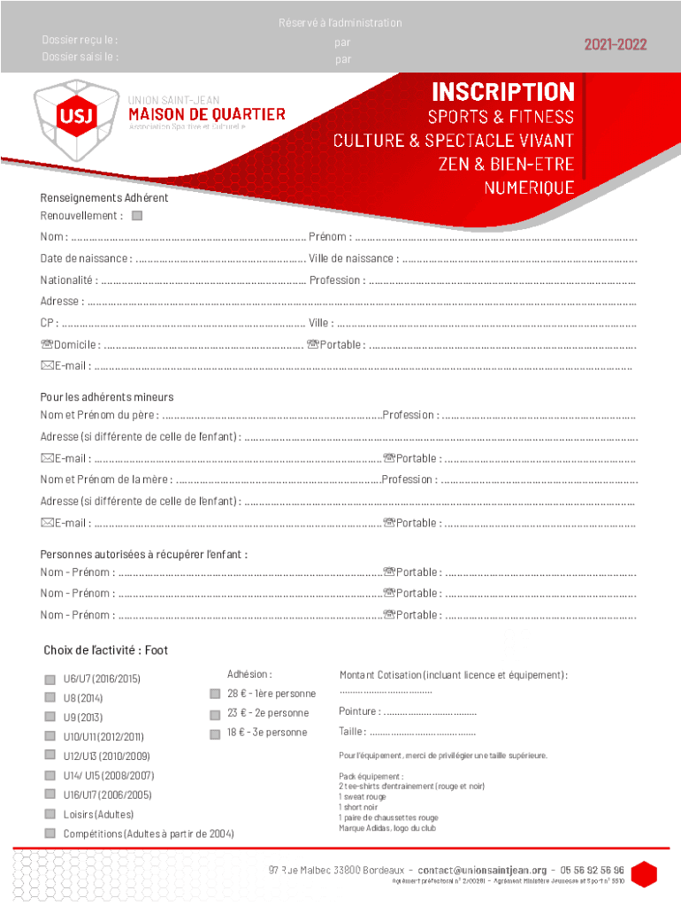 Serve administration Dossier red LE : Dossier said LE :20192020par par UNION SAINTJEANMAISON DE QUARTER Association Sportive et CulturelleRenseignements Adhrent20212022INSCRIPTIONSPORTS & FITNESS