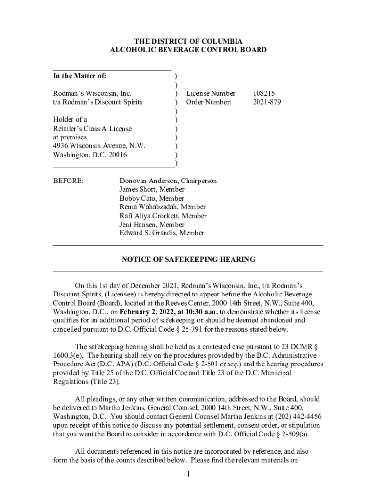 THE DISTRICT OF COLUMBIA ALCOHOLIC BEVERAGE CONTROL BOARD ___ In the Matter of:)) Romans Wisconsin, Inc.) t/a Romans Discount Spirits)) Holder of a) Retailers Class A License) at premises) 4936 Wisconsin