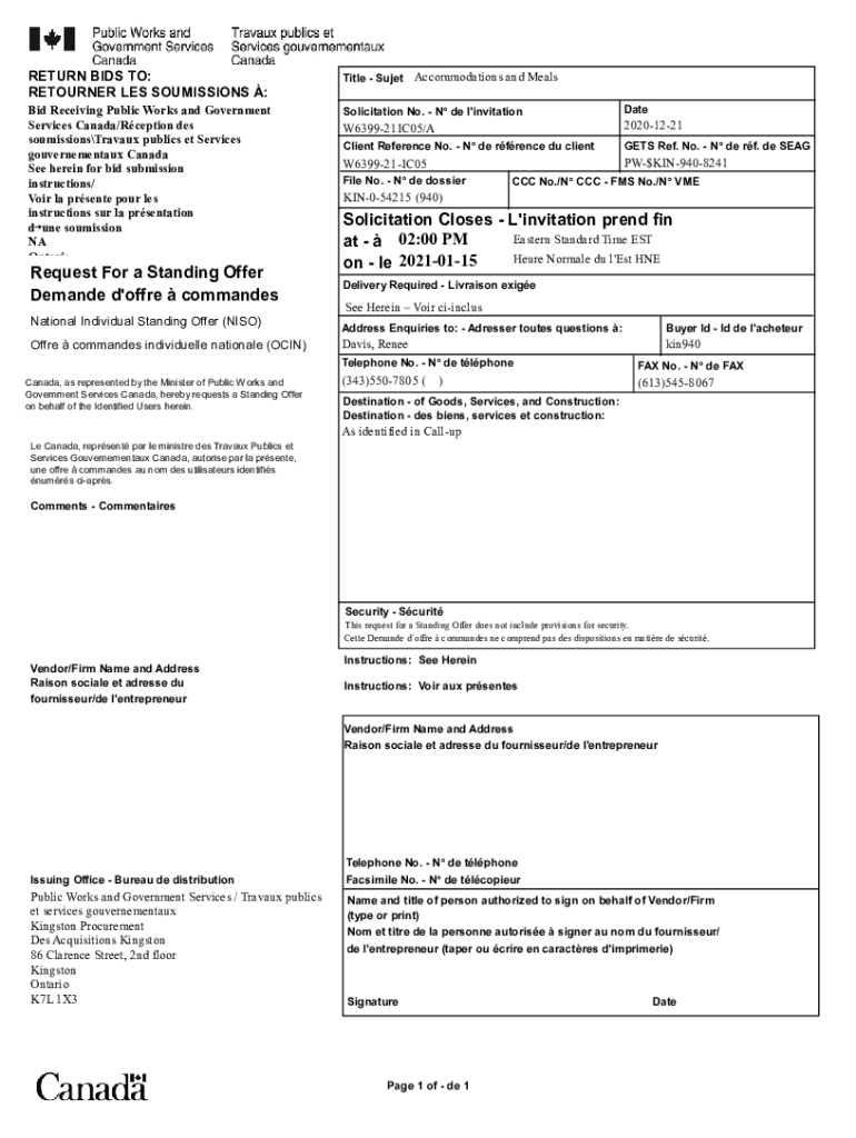 11RETURN BIDS TO: RETURNER LES COMMISSIONS :Title Suet Accommodations and Meals Receiving Public Works and Government Services Canada/Reception DES soumissionsTravaux public set Services gouvernementaux