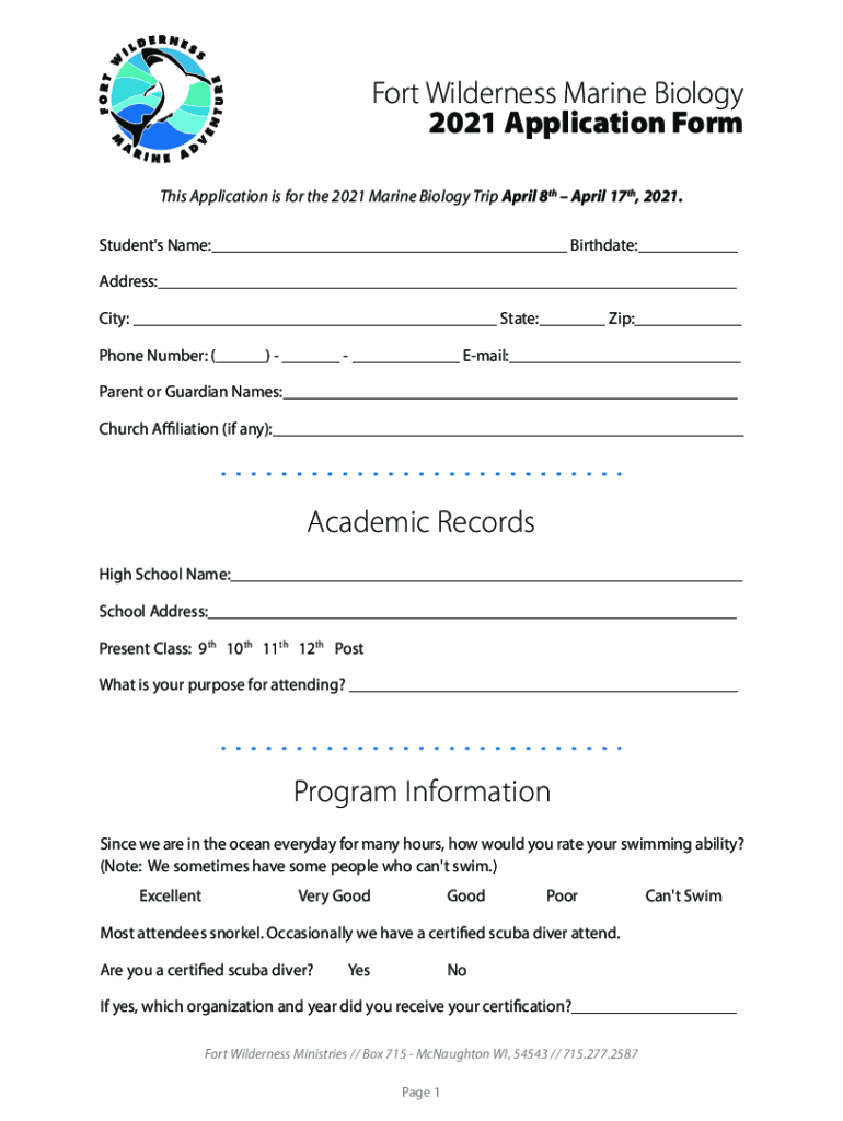 Fort Wilderness Marine Biology 2021 Application Form This Application is for the 2021 Marine Biology Trip April 8th April 17th, 2021. Student\'s Name:___ Birthdate:___ Address:___ City: ___ State:___