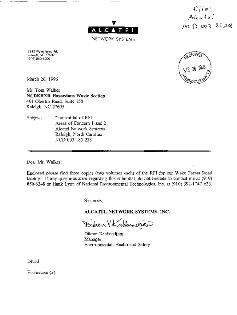 R, ... I\'(? , A/cover /VC 0 00 3 8 S.;238 NETWORK SYSTEMS 2912 Wake Forest Rd, Rale;GH, NC 27609 (919) 8506000March 26, 1996 Mr. Tom Walker NADER Hazardous Waste Section 401 Oberlin Road, Suite 150
