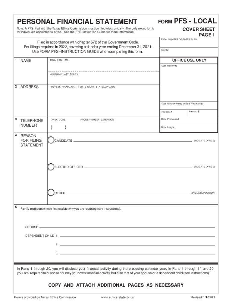 PERSONAL FINANCIAL STATEMENTFORMPFS Locality: A PFS filed with the Texas Ethics Commission must be filed electronically. The only exception is for individuals appointed to office. See the PFS Instruction