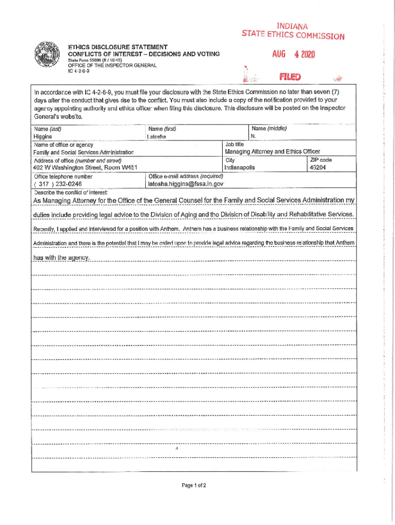 INDIANA STATE ETHICS COMMISSION ETHICS DISCLOSURE STATEMENT CONFLICTS OF INTEREST DECISIONS AND VOTING AUG 42020State Form 55860 (R, 10.15)OFFICE OF THE INSPECTOR GENERAL 1C 4269PLEDIn accordance