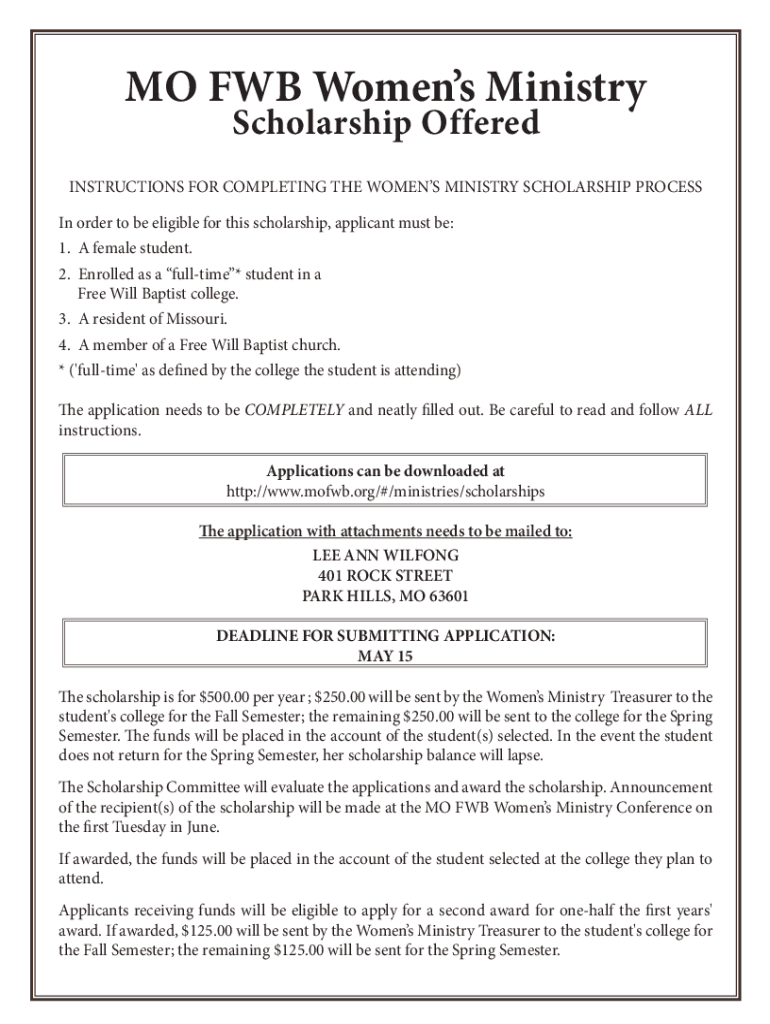 MO FWB Women's Ministry Scholarship OfferedINSTRUCTIONS FOR COMPLETING THE WOMEN MINISTRY SCHOLARSHIP PROCESS In order to be eligible for this scholarship, applicant must be: 1. A female student.