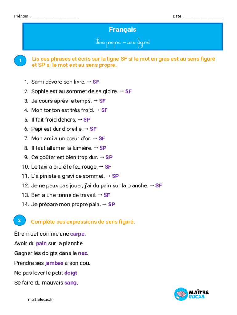 Prom : ___Date :___Francis Sens proper sens figure 1Lis CES phrases et Chris SUR la line SF is LE mot en gas BS tau sens figure et SP is LE motes tau sens proper. 1. Sami devoré son live.SF2. Sophie