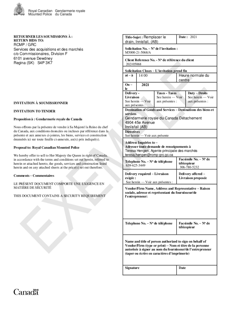 RETURNER LES COMMISSIONS : RETURN BIDS TO:RCMP / GRC Services DES acquisitions et DES marches c/o Commissionaires, Division F 6101 avenue Dewey Regina (SK) S4P 3K7TitleSujet : Rem placer legate :
